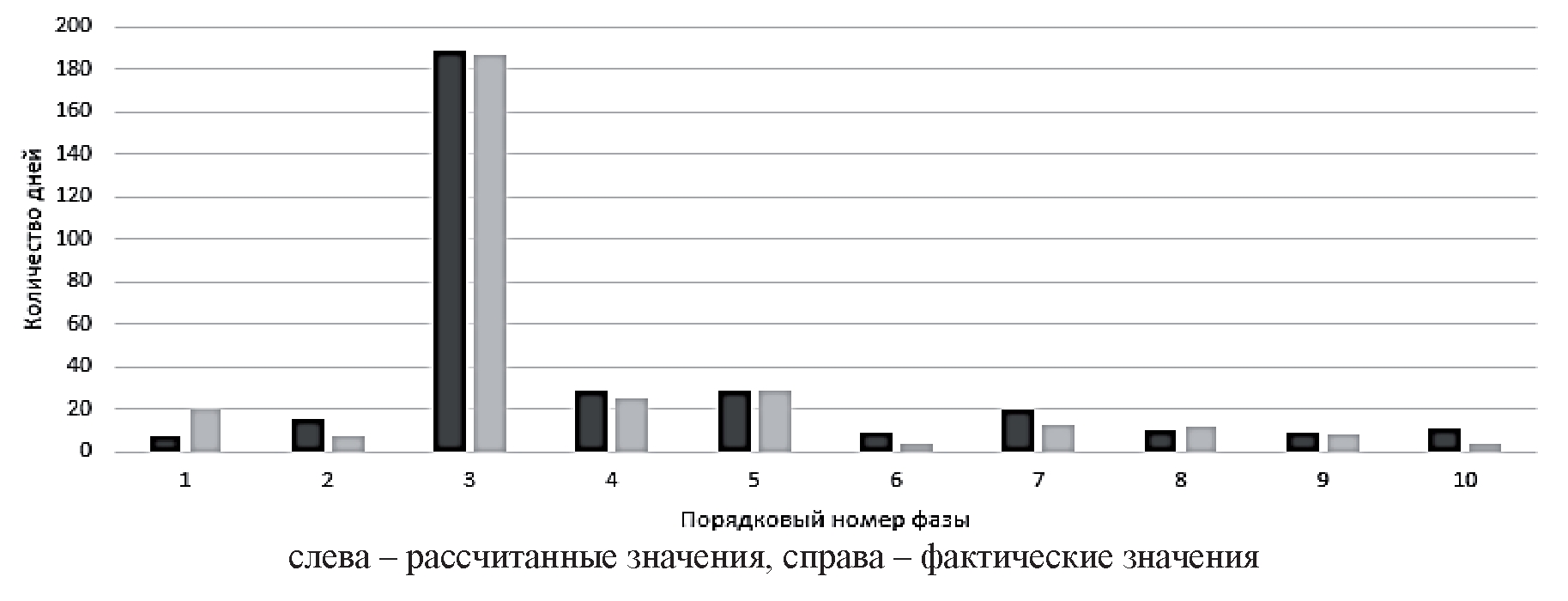 Рисунок 10 – Сравнение количества фактических и рассчитанных дней длительности фаз. Cлева – рассчитанные значения, справа – фактические значения