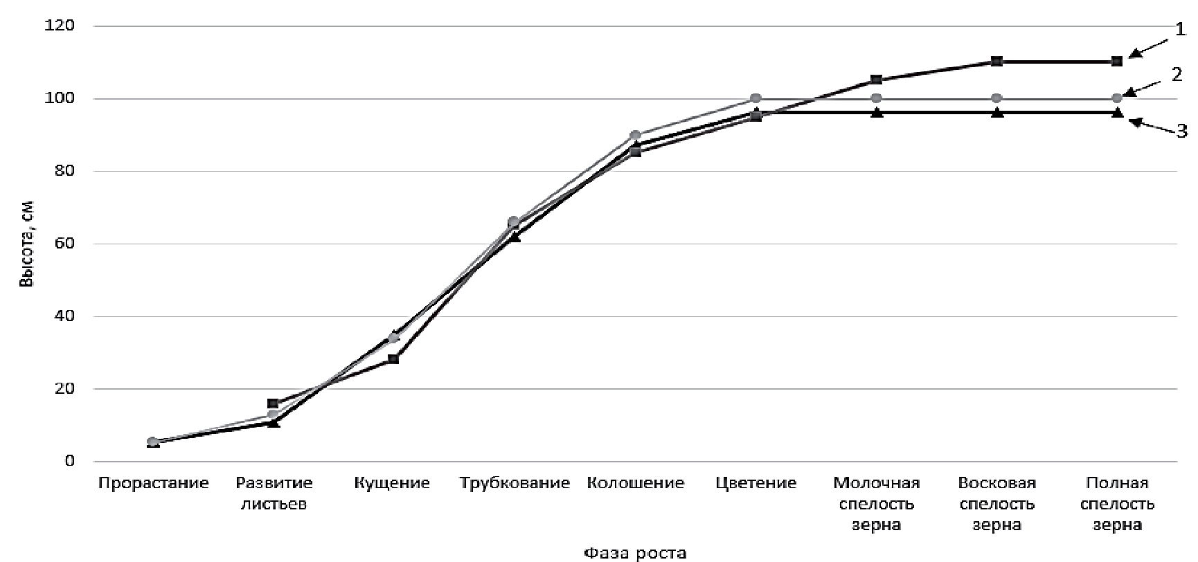 Рисунок 11 – Сравнение фактических и рассчитанных значений высоты растения. 1 – фактические значения, 2 – значения, рассчитанные моделью ЦД растений, 3 – значения, рассчитанные предложенным методом