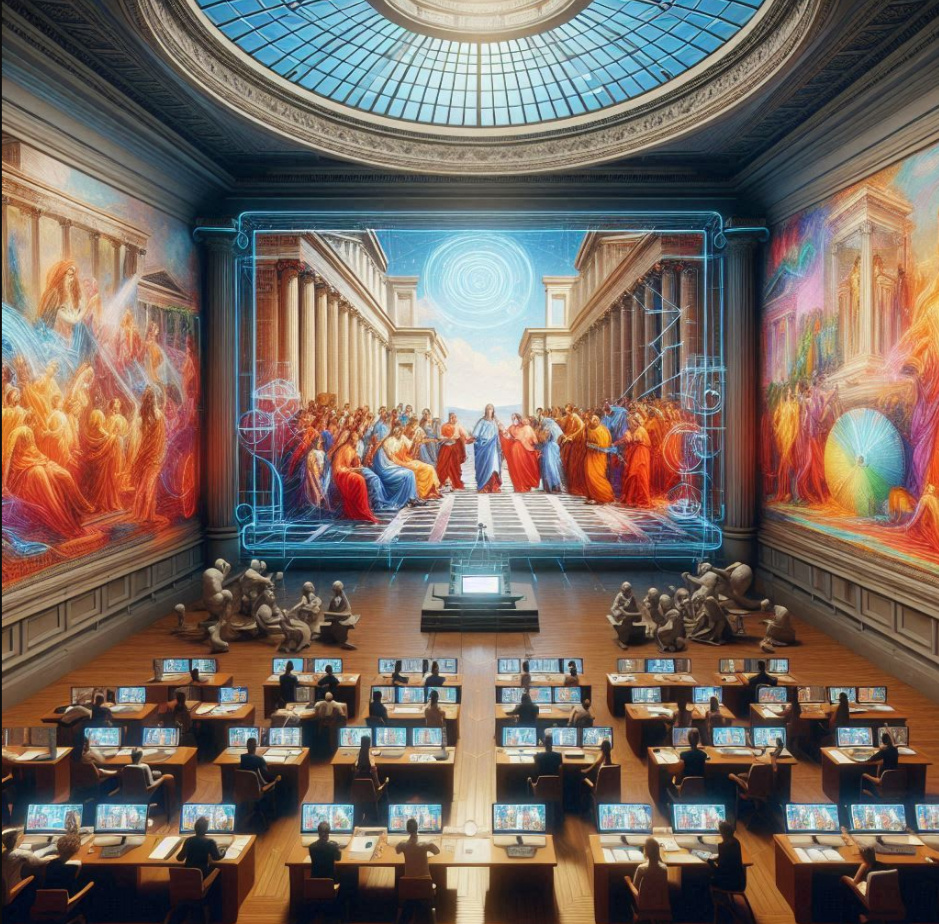 «Афинская школа» в цифровую эпоху. Создано Эриком Брауном7 в генераторе изображений AI Dall-E 3. Dall-E 3 AI Image Generator - https://dalle3.org