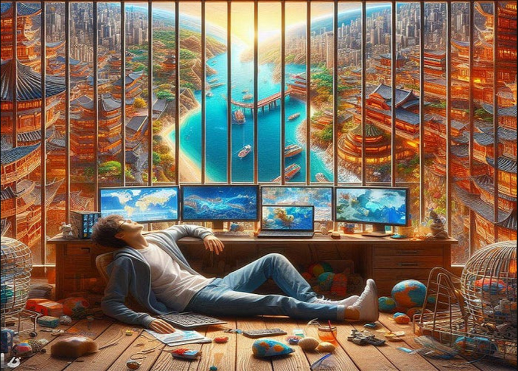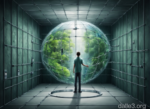 Иллюстрация, созданная Dall-E 3 по описанию: «Человек находится в виртуальной клетке вместе с новыми технологиями. Эти технологии ограждают и изолируют его от реального мира. Вокруг реальный мир, мир природы, реальная жизнь, но человек не видит и не замечает этот реальный мир»