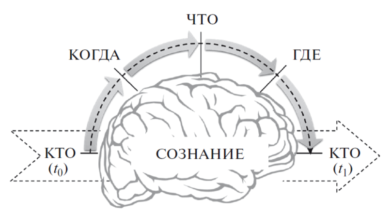 «Где» и «когда»: динамические аспекты сознания. В ходе начальной параметризации сознания выделено два его базовых свойства. Во-первых, это качественные характеристики феноменальных состояний – «что». Во-вторых, это специфические операции над этими состояниями, обеспечивающие доступ субъекта к их содержанию. Сами эти процессы недоступны осознанию, но составляют непременные компоненты любого явления сознания. Их можно было бы обозначить общим термином «как», который следует разделить на «как» в смысле «где» и «как» в смысле «когда».