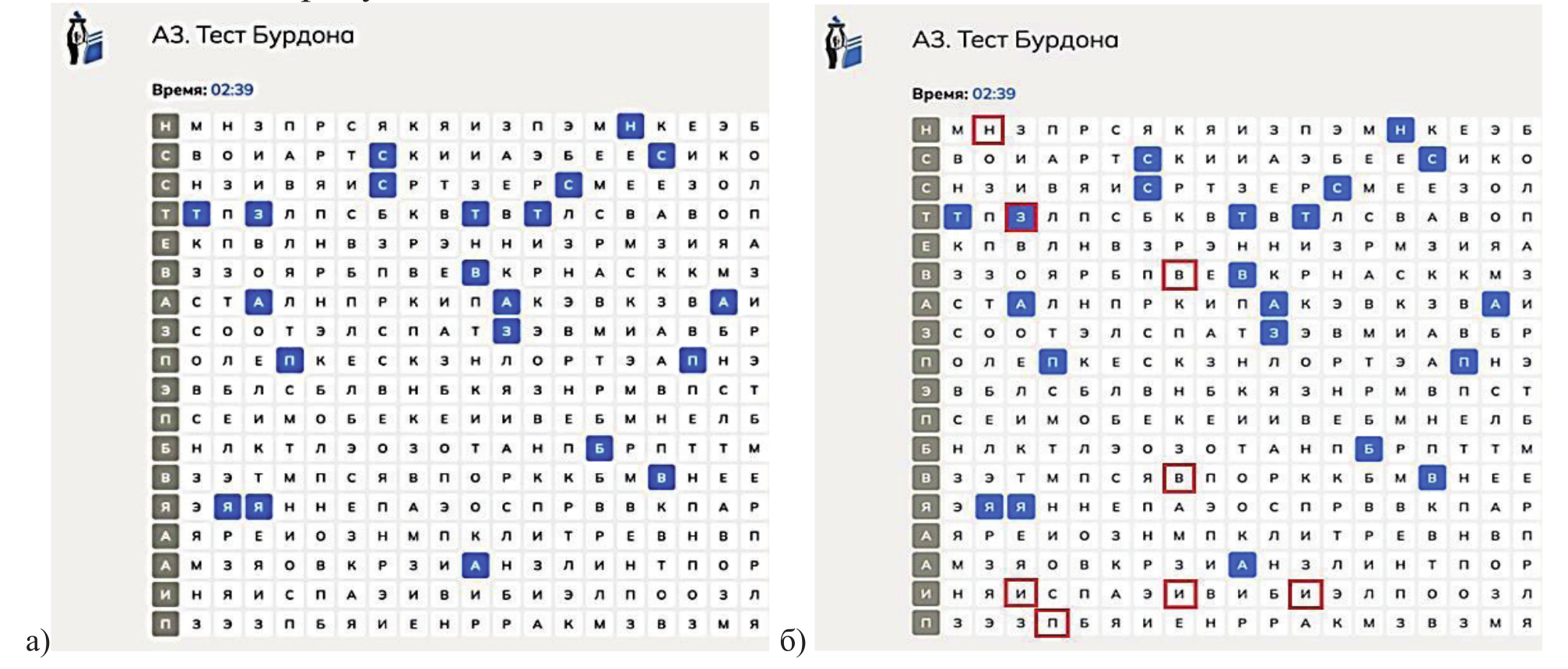 На рисунке 5 приведён пример реализации знаков-индексов для привлечения внимания пользователя. Корректурная проба Бурдона проводится с помощью набора большого количества похожих знаков, например, букв. Пользователю необходимо в каждой строке найти и выделить заданные символы. АПК каждую минуту отмечает зону текущего внимания пользователя и сообщает ему об этом. Цветовая индикация позволяет использовать знаки – указатели на ответы пользователя (рисунок 5а). Другой вариант (рисунок 5б) состоит в подсвечивании ошибок и пропусков на активном поле.