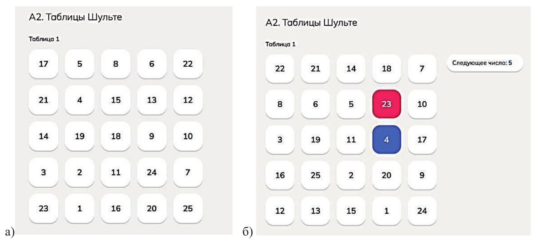 а) – классическое представление таблицы Шульте; б) – использование подсказок: выбранный вариант подсвечивается синим цветом (4), а ошибочный ‑ красным (23)