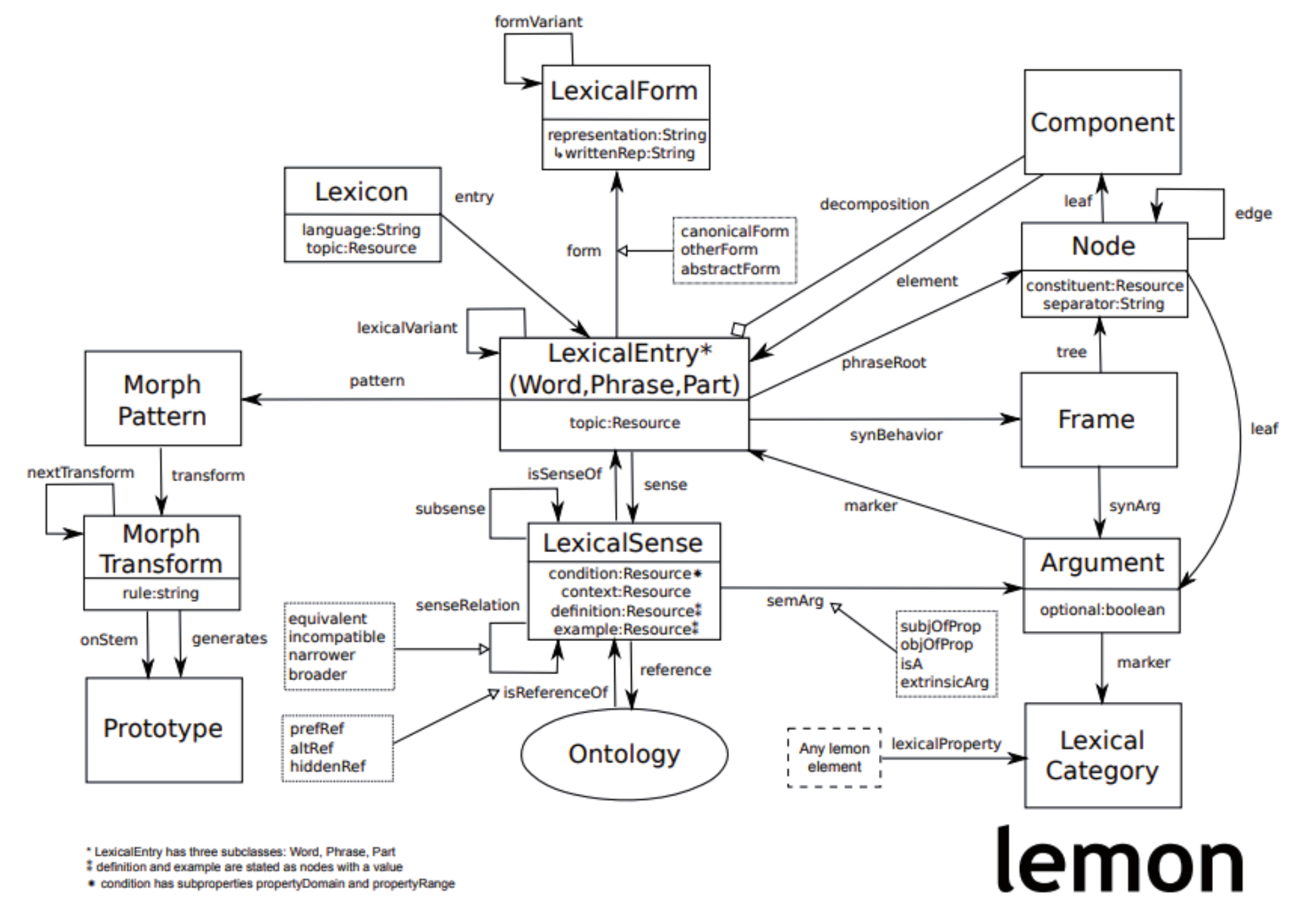 - McCrae JP, Spohr D, Cimiano P. Linking lexical resources and ontologies on the semantic web with Lemon // In: G. Antoniou, M. Grobelnik, E.P.B. Simperl, B. Parsia, D. Plexousakis, P.D. Leenheer, J.Z. Pan (eds.): The Semantic Web: Research and Applications. Proc. 8th Extended Semantic Web Conference ESWC 2011 Part I (Heraklion, Greece, May 29 - June 2, 2011). Lecture Notes in Computer Science, vol 6643. Berlin Heidelberg: Springer, 2011: 245-259. doi: 10.1007/978-3-642-21034-1_17.