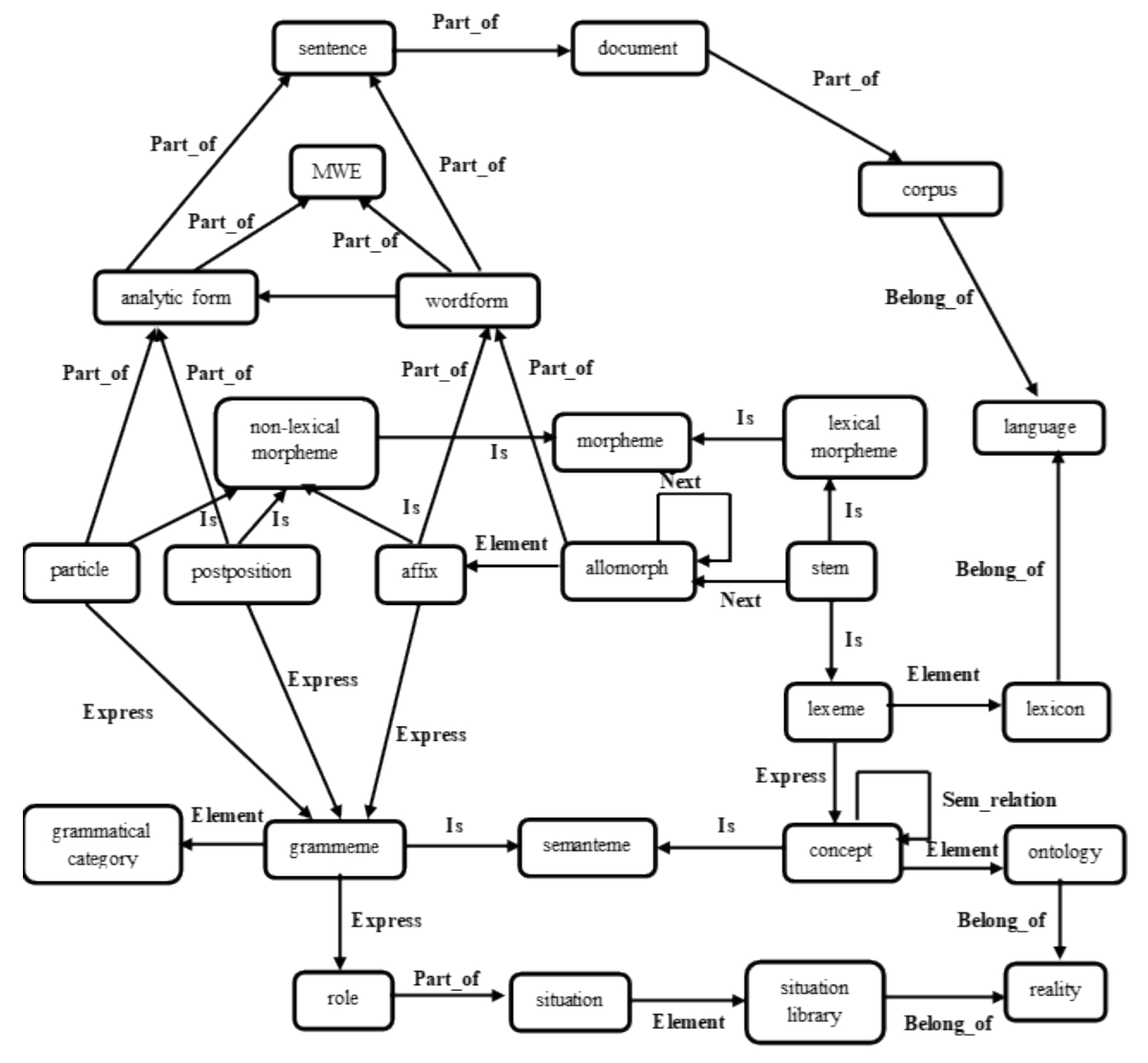 Ключевым элементом модели является морфема (morpheme), которая может быть лексической (lexical) или грамматической (non lexical). В качестве грамматических морфем выступают аффиксальные морфемы (affix), послелоги (postposition) и частицы (particle). Аффиксальная морфема объединяет в себе несколько алломорфов (allomorph), которые представляют использование аффикса в тексте.