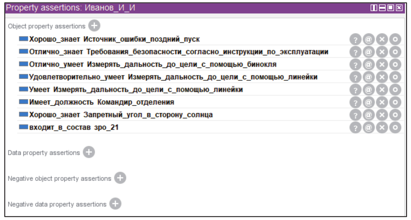 Пример запроса о составе группы и выполняемых функциях специалистов в группе представлен на рисунке 4. Результаты запроса выводятся в виде таблицы, что позволяет руководителю занятия оперативно планировать мероприятия АП независимо от специфики задач, выполняемых группой обучаемых. Для руководителя занятия имеется возможность с использованием запросов к метаонтологии уточнять информацию о наличии определённых знаний и умений у обучаемых.