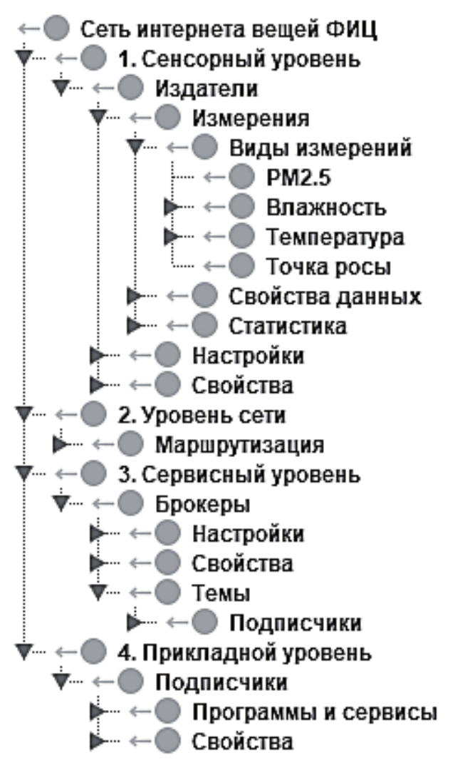 На рисунке 2 показаны значимые характеристики издателей, расположенных на сенсорном уровне: измерения (их виды, статистика и свойства данных), свойства устройств, настройки и публикуемые темы.