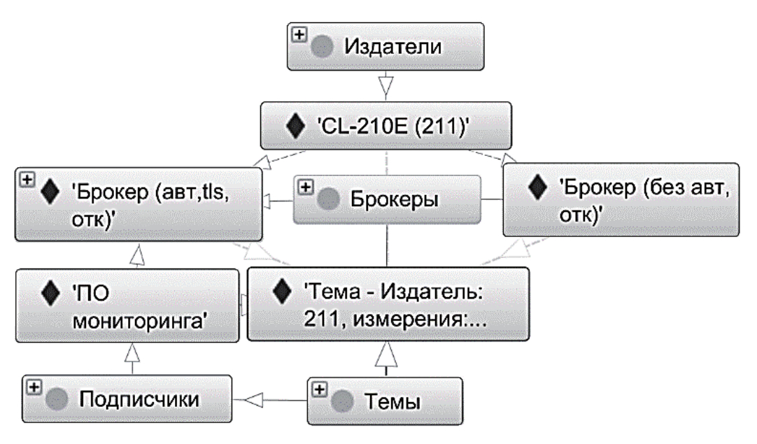 На рисунке 4 приведён фрагмент онтологии, содержащей набор издателей, подписчиков и брокеров, связанных темой. Задачи реинжиниринга сети включают выбор наиболее подходящих брокеров, с которыми взаимодействуют потребители информации, и изменение свойств подписки. На рисунке показан пример выбора брокера, который публикует данные по заданной теме. Название темы формирует издатель «CL-210E (211)» (его характеристики представлены на рисунке 3). Выбранная тема публикуется двумя брокерами, имеющими разные настройки безопасности (указаны в их наименованиях).