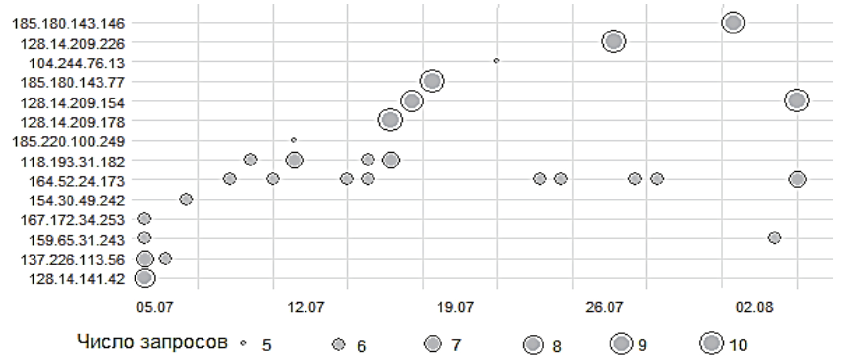 Рисунок 5 – Пример статистики нелигитимных обращений (оси: дата, ip-адрес источника обращения)