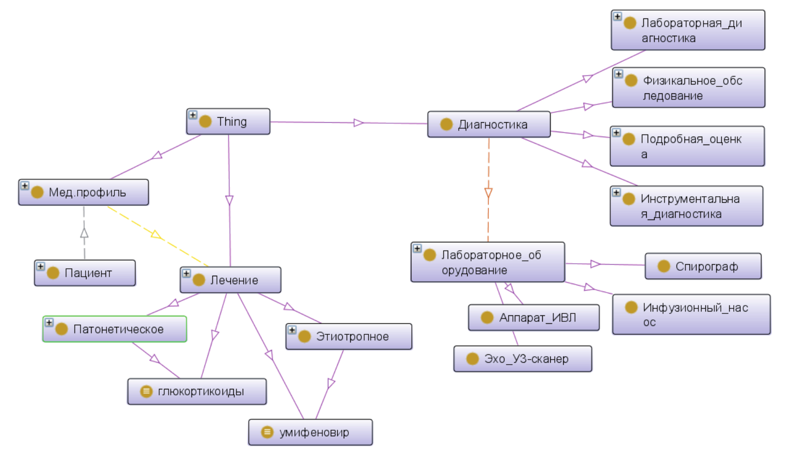 Возможным средством решения задачи построения информационного хранилища СППР ПрО лечения бронхолёгочных заболеваний может стать онтология [8]. Онтологический подход позволяет связать терминологию и клинические рекомендации и на их основе разработать деревья принятия решений, из которых формируются ПП. Совокупность правил позволит объединить в единую БЗ клинические рекомендации [9].