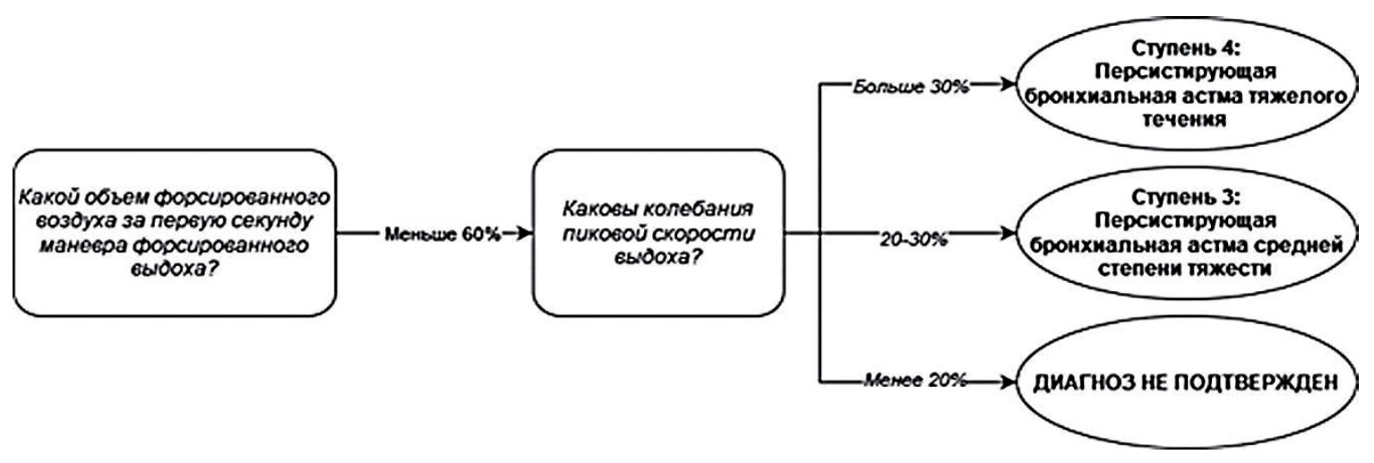 - ЕСЛИ у пациента объём форсированного воздуха за первую секунду маневра форсированного выдоха меньше 60% И колебания пиковой скорости выдоха от 20 до 30%, ТО может быть поставлен диагноз «Ступень 3: Персистирующая бронхиальная астма средней степени тяжести»;