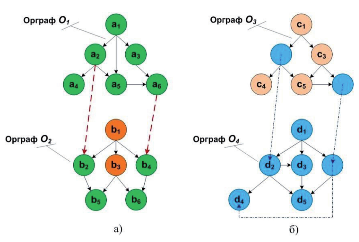 Структурная связность. Такие связи между понятиями онтологий определяют повторную используемость в некотором орграфе онтологии подграфов орграфов других онтологий. Такие подграфы могут представлять собой как единственную терминальную вершину, так и орграф в целом. На рисунке 3а связи данного типа представлены пунктирными дугами a2 ®b2 и a6 ®b4. Вершины b2, b4, b5, b6 принадлежат орграфу онтологии O2, но становятся достижимы и тем самым логически включены и в состав орграфа онтологии O1.