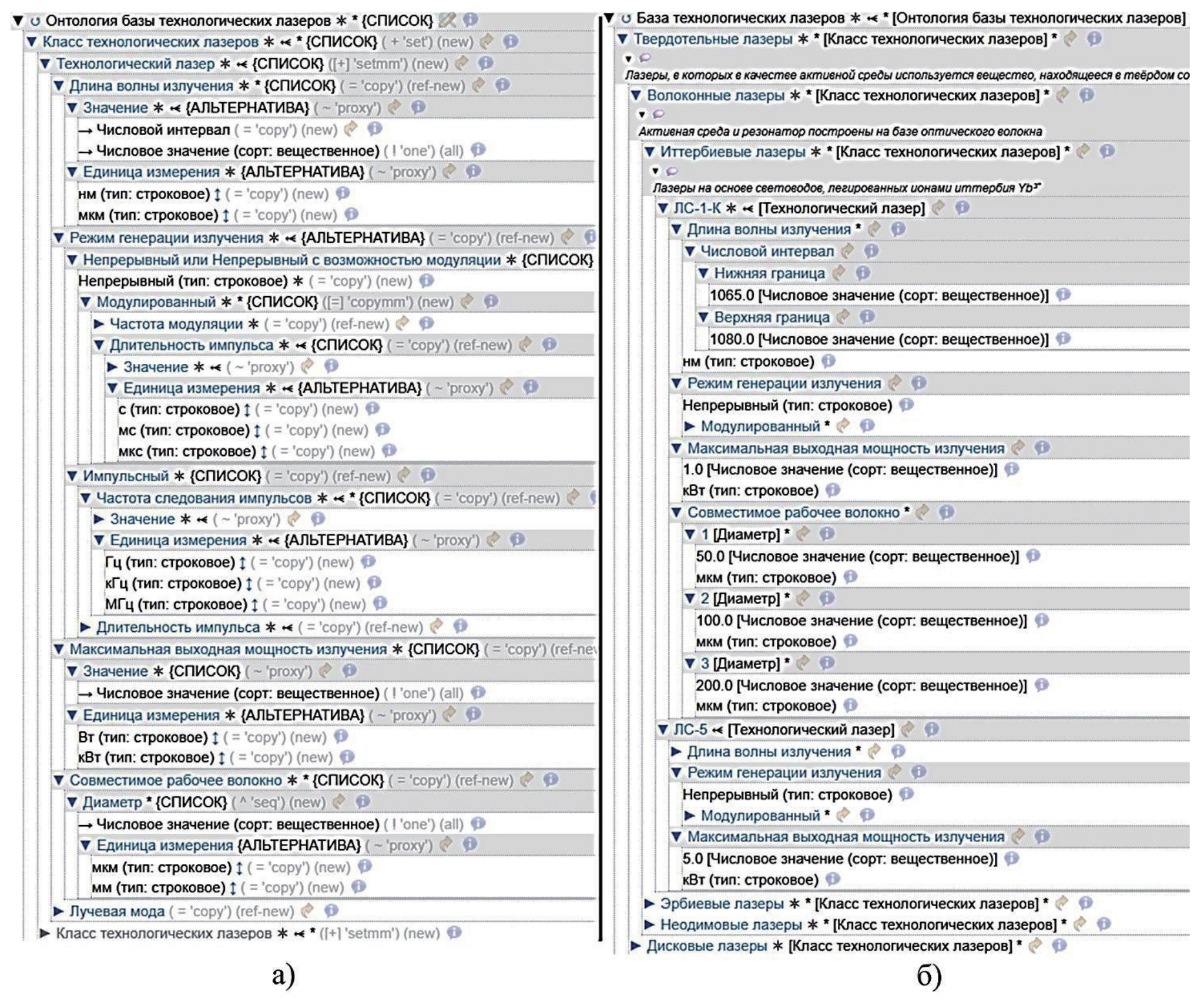 Рисунок 42 – Фрагмент онтологии базы технологических лазеров (а) и фрагмент формируемой на её основе базы технологических лазеров (б)