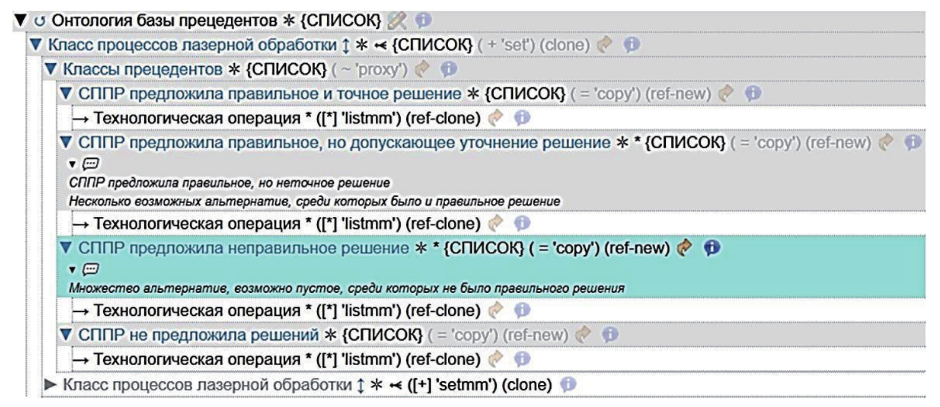 В соответствии с переработанной онтологией архива протоколов ТО лазерной обработки была модифицирована и онтология базы прецедентов [25]. Она определяет структуризацию базы прецедентов – протоколов проведённых ТО, иерархически сгруппированных по видам обрабатываемых материалов, типам выполняемой задачи, а также распределённых по классам прецедентов в зависимости от трёх факторов: предложенных СППР параметров выполнения ТО, фактически выбранных технологом (оператором) параметров выполнения ТО и результата выполнения ТО (рисунок 9).