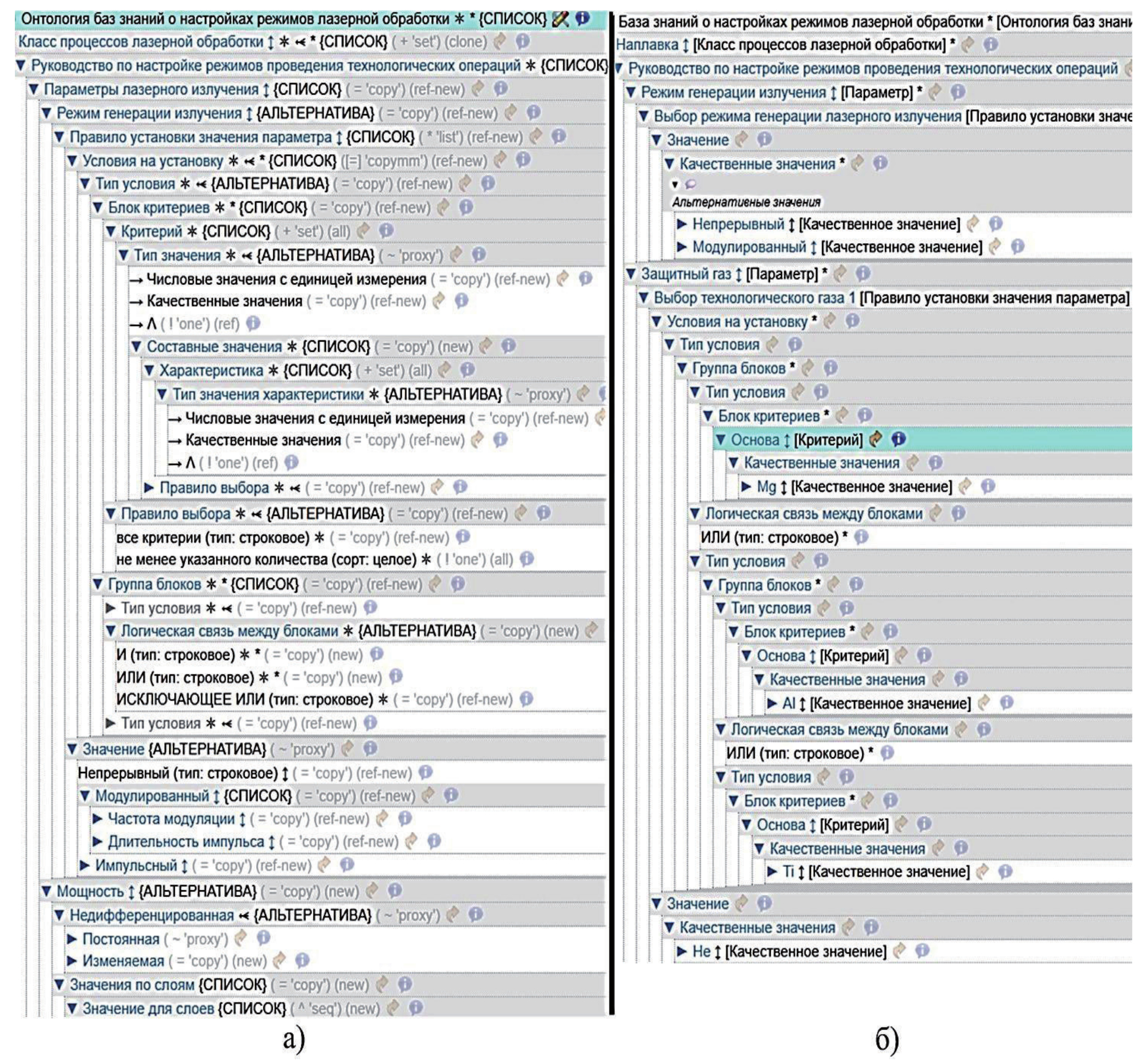 Рисунок 10 – Фрагмент онтологии базы знаний о настройках режимов лазерной обработки (а) и фрагмент формируемой на её основе базы знаний (б)