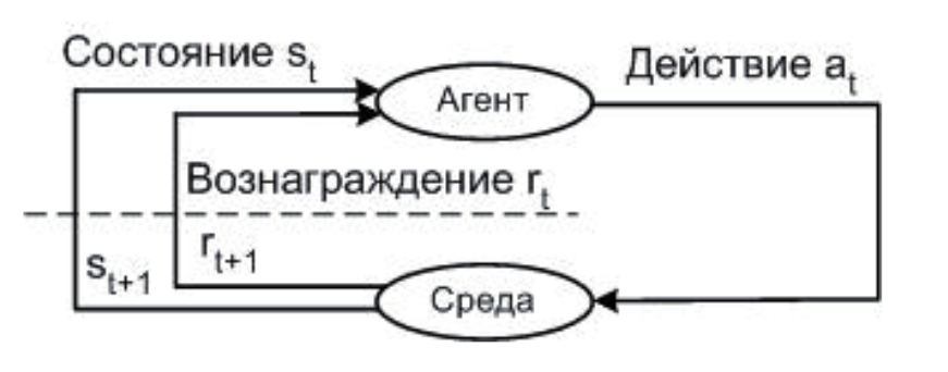 Модель формирования ИТР работников основана на МОП, в ходе которого субъект управления (агент) обучается, взаимодействуя с объектом управления (средой). МОП реализует цикл управления с обратной связью (см. рисунок 2), где агент и среда обмениваются сигналами, при этом агент стремится максимизировать целевую функцию. Обе стороны взаимодействуют непрерывно: агент выбирает действия, а среда реагирует на эти действия и предлагает агенту новые ситуации. Среда генерирует вознаграждения – числовые значения, которые агент стремится максимизировать посредством выбора действий.
