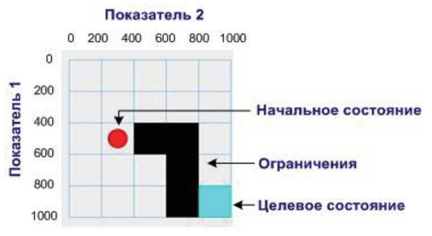 На рисунке 3 в качестве примера представлены результаты оценки работника, отмеченные в ячейке (3,2), – это начальное состояние его ЧК. При определении цели, т.е. уровня потенциально возможного ЧК для конкретного работника, учитывается ряд ограничений, связанных с его особенностями. На рисунке показана область ограничений в виде ячеек, залитых чёрным цветом. Показано, что для этого работника существует возможность движения в сторону улучшения ЧК – цели, ячейка (5,5). Если для работника с учётом его текущего уровня образования и характеристик здоровья невозможно достичь максимально уровня (ячейка 5,5), то для него определяется другая цель. По совокупности факторов здоровья этому работнику не удастся добиться повышения уровня профессионализма в данной области (с учётом низких значений уровня здоровья). Т.е. условия профессии таковы, что достижение уровней 3 и 4 профессионального развития невозможно для работника с низкими показателя здоровья, ячейки (3,3), (3,4). При высоких показателях уровня здоровья работника ему доступен переход на высший уровень компетентности, т.е. быстрый переход на уровень 5 по показателю 2, ячейки (4,5), (5,5).