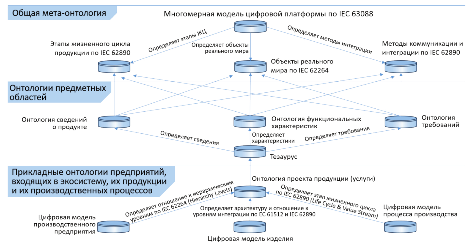 Современные ИЦП основаны на проектных репозиториях, в которых каждый элемент ТС может иметь разное значение функции принадлежности, выраженное через предикат соответствия «представление-связь». Такие репозитории, где элементы заданы лингвистически, можно создать посредством системы управления знаниями, которая выражается системой взаимосвязанных онтологий. Для обеспечения функционирования производственных предприятий, находящихся в единой цифровой экосистеме на базе эталонной модели, реализуется многоуровневая система иерархически связанных онтологий, включающая: