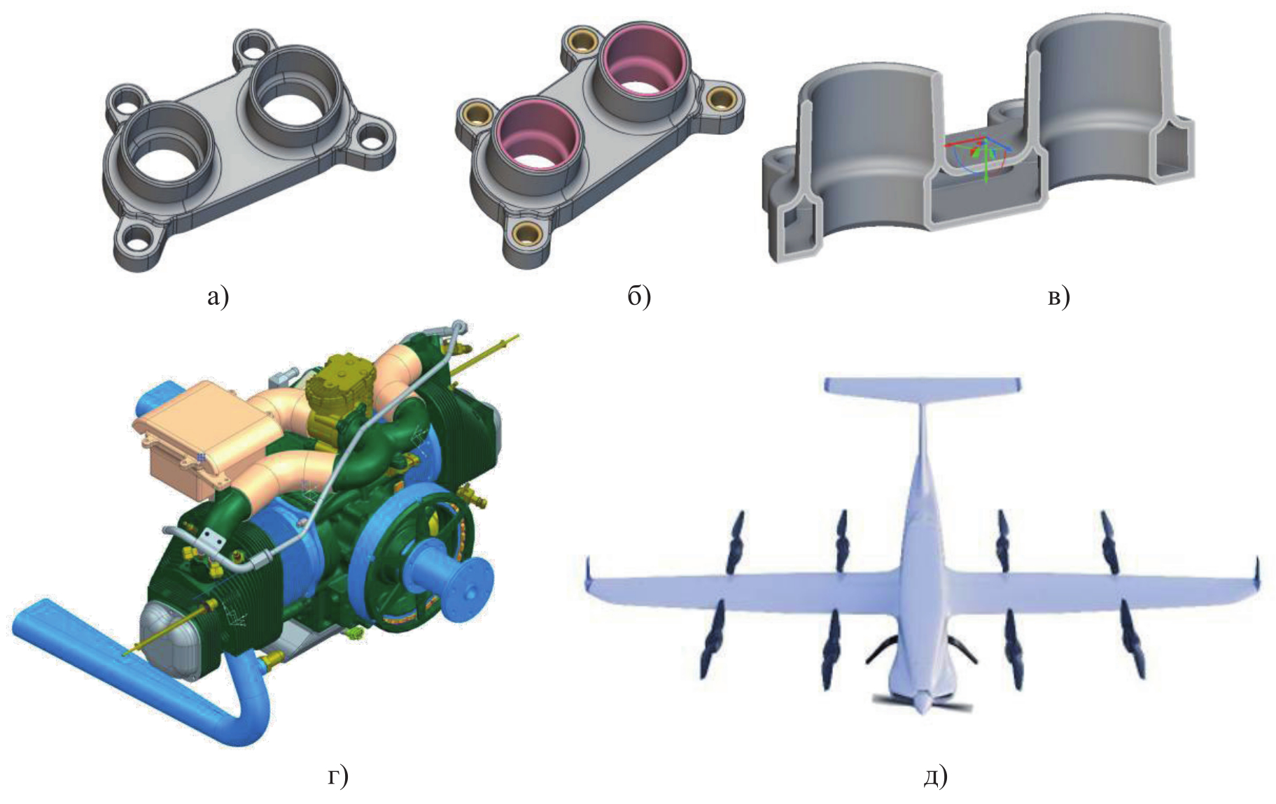 Рисунок 1 – а) Трёхмерная модель основания кожуха штанги толкателя в nTopology; б) STEP-модель и зоны фиксации/нагружения в nTopology; в) проектируемая область изделия; г) двигатель МП 1400; д) беспилотный летательный аппарат вертикального взлета и посадки Р-265