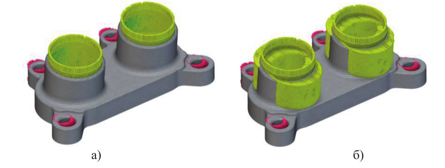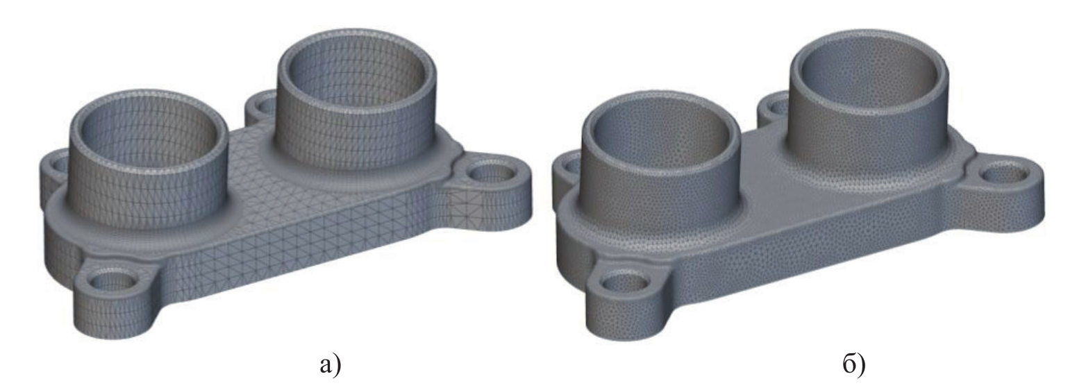 В начальной дискретизации использовано значение допуска 0,1 мм и максимальный размер элемента (треугольника сетки) – 3 мм. (см. рисунок 2а). Равномерная КЭ сетка с одинаковыми элементами перестроена с использованием адаптивных параметров (см. рисунок 2б) c настройками: размер ребра 0,2–0,5 мм; допуск – 0,01 мм; рост ребра – 2; тип элементов – тетраэдры линейного порядка; параметр учёта резких границ – 45°.