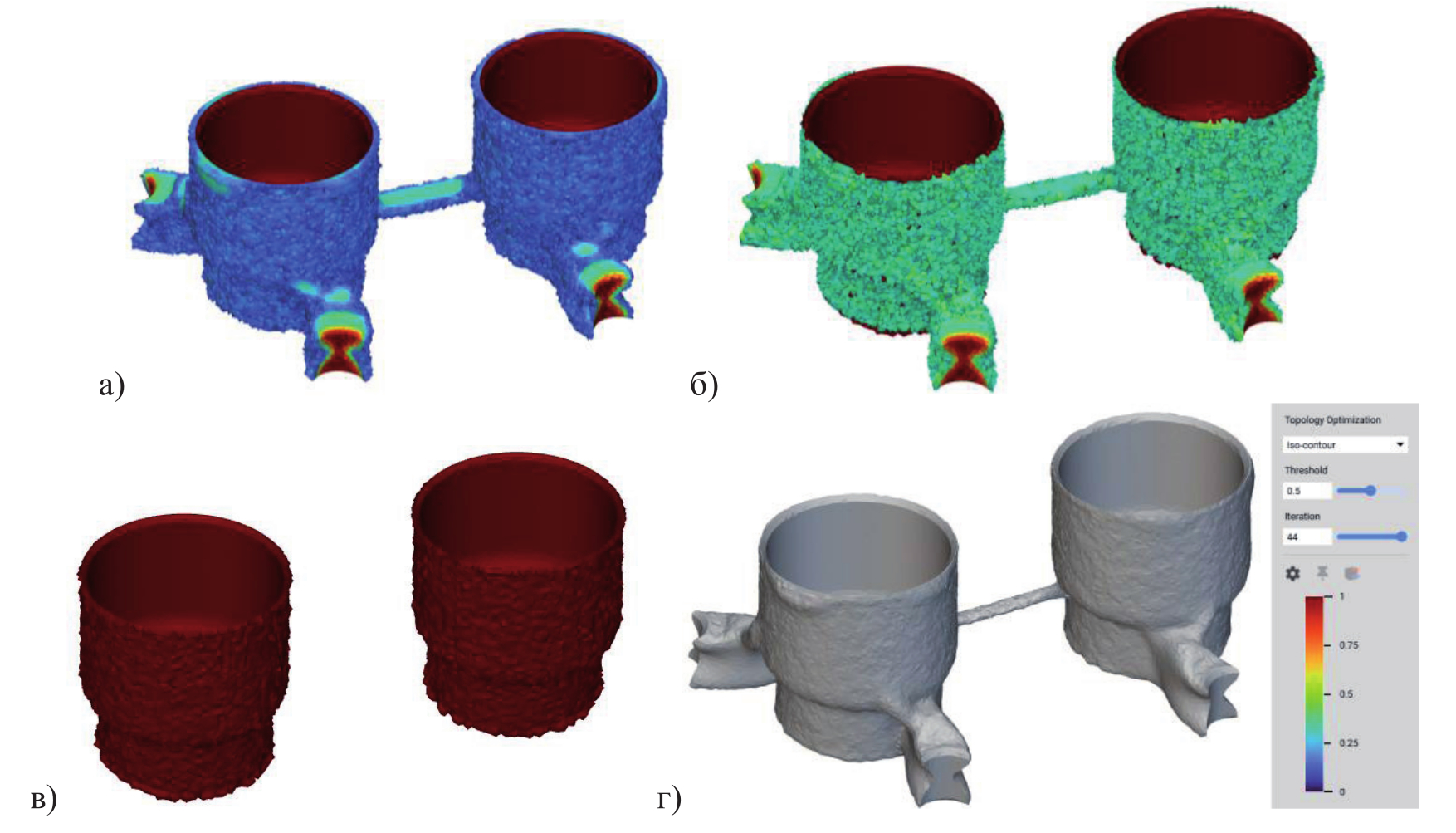 Рисунок 6 – Варианты формы (топологии) детали после оптимизации. Порог отсечения: а) 0,1; б) 0,3; в) 1; г) 0,5