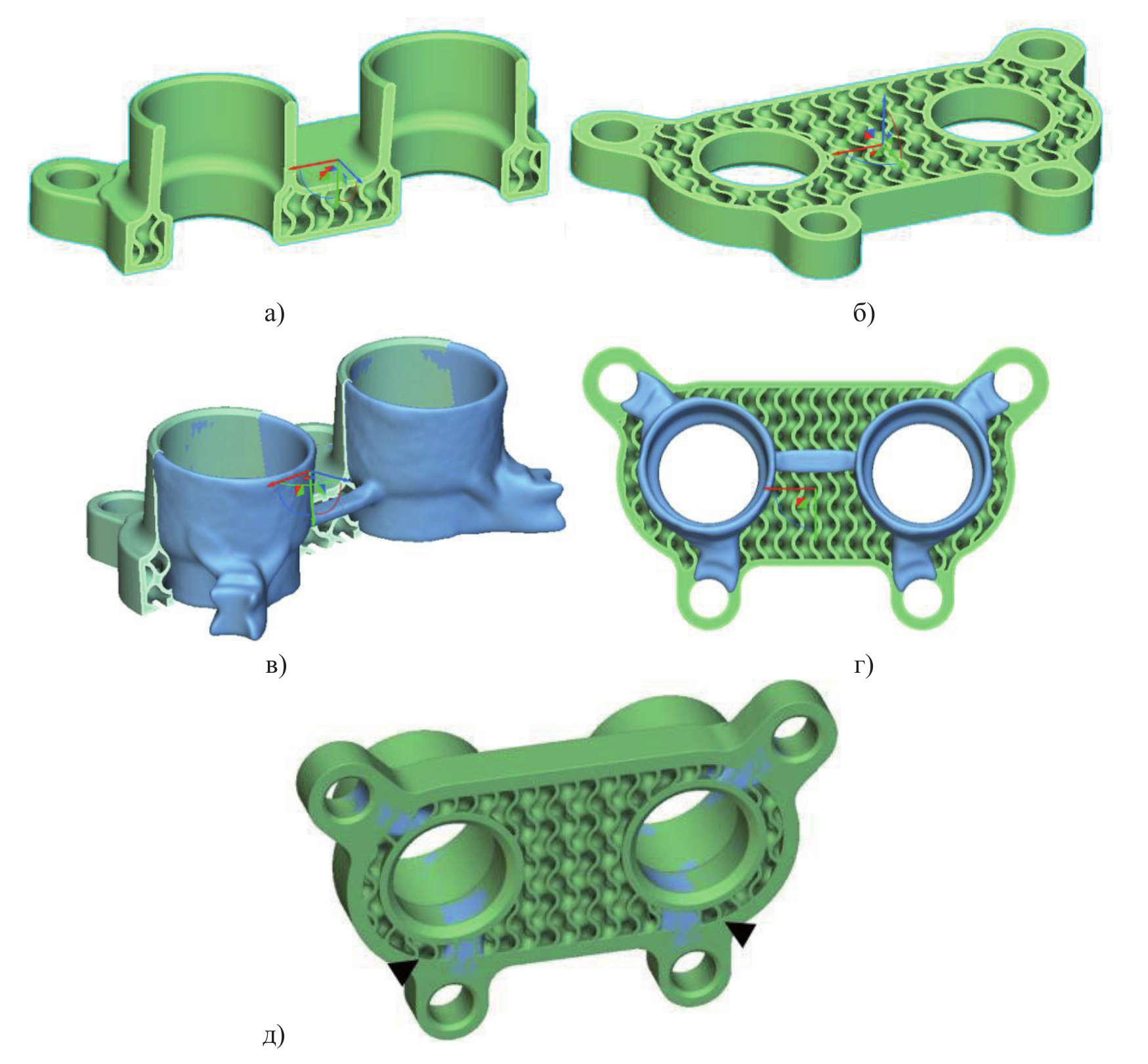 Рисунок 8 – а, б) разрезы детали с ТПМП-заполнением; в, г) итоговая конструкция после объединения оболочки, гироидного заполнения и оптимизированного каркаса (поперечный и фронтальный срезы); д) вырез для удаления порошка из ТПМП-структуры