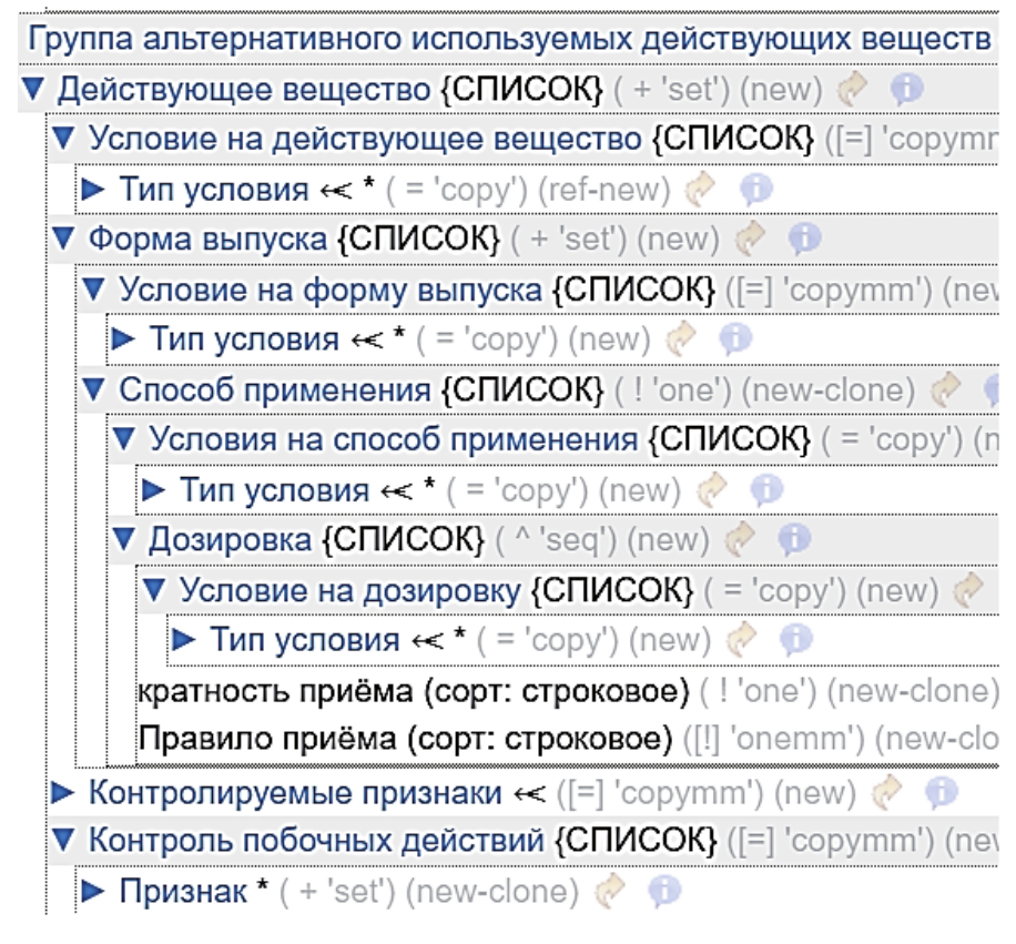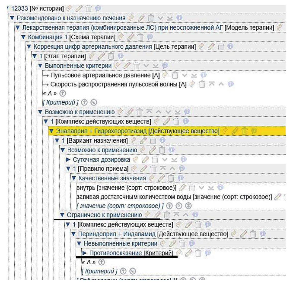 Таким образом, реализуется динамический контроль текущего клинического состояния пациента на фоне проведения медикаментозной терапии. Для оценки эффективности проводимой терапии в ГЗ лечения для каждого ЛС или их комбинации предусмотрен элемент знаний «критерии оценки эффективности лечения», согласно которому в данном клиническом примере формируется описание ежедневного контроля эффекта проводимой терапии через signNamejt = артериальное давление.