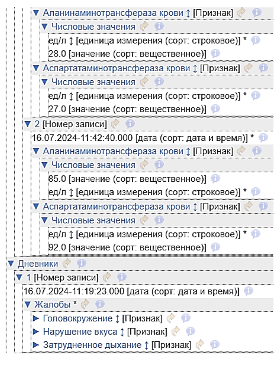 На фоне приёма данного ЛС регистрируется изменение клинической картины (см. рисунок 6): появление новых жалоб (головокружение, нарушение вкуса, затруднённое дыхание) совместно с резким ухудшением биохимических исследований крови (АЛТ, АСТ). Проверяется предикат isDifferentFromExpected (головокружение (t(k+1))), isDifferentFromExpected (нарушение вкуса (t(k+1))), isDifferentFromExpected (затруднённое дыхание (t(k+1))). Объяснением становится обнаруженное изменение некоторых показателей состояния ({signNamek}): ((eventu = «Индапамид + Периндоприл», continu = 1 сут), ((signName1 =АЛТ, ValuesTrend(1,u) = повышение), (signName2 = головокружение, signValuesRange(2,u)= Имеется), (signName3 = нарушение вкуса, signValuesRange(3,u)= Имеется), (signName4 = затруднённое дыхание, signValuesRange(4,u) = Имеется), …)).