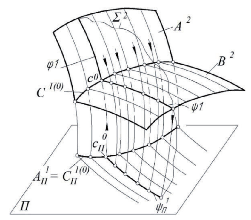 - A2→AΠ1 = CΠ1(0) – след проецирующей поверхности A2 и одновременно φ-проекция искомой линии пересечения C1(0)
