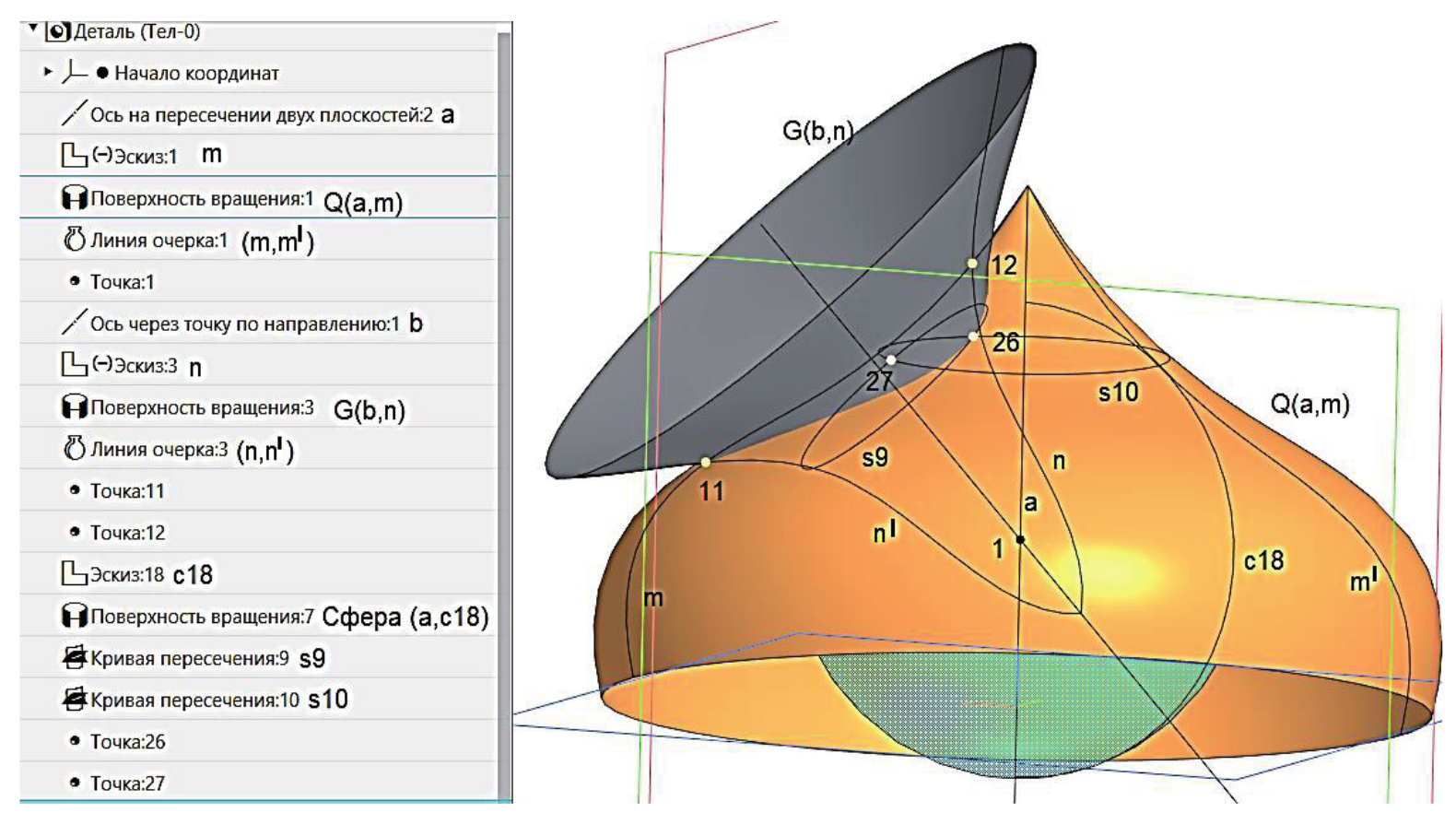Для второй поверхности вращения G(b,n) её формирование выполнено вращением полумеридиана n относительно оси b. Координатной плоскости ZX принадлежат составные очерки () и () исходных поверхностей Q и G соответственно. Точки пересечения этих очерков (две точки) служат опорными точками искомой линии пересечения исходных поверхностей. На рисунке 6 приведена сфера (a, c18), построенная как поверхность вращения по оси a и полуокружности c18 с центром на оси a. Сфера (a, c18) пересекает поверхности G и Q по окружностям s9 и s10 соответственно, общие точки 26 и 27 которых принадлежат искомой линии пересечения . На рисунке 7 в дереве построений приведена последовательность построений промежуточных точек линии пересечения и их визуализация на 3D-модели на основе использования способа секущих концентрических сфер, который соответствует алгоритму 2. Интерполяция полученного пространственного дискретного ряда даёт искомую линию пересечения (сплайн 4 в дереве построений) исходных поверхностей вращения Q и G.