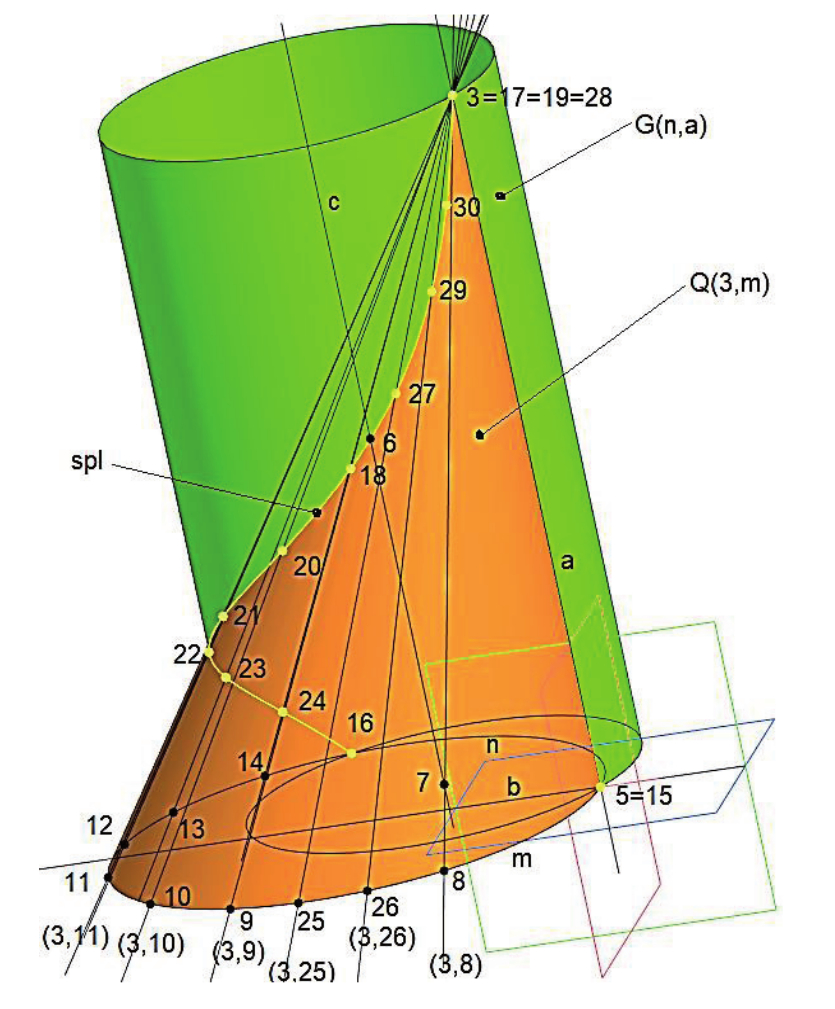 В итоге биквадратная линия пересечения заданных квадрик представляется в виде двух компонент: пространственной алгебраической кривой третьего порядка Spl и прямой линией a. (Порядок пространственной алгебраической кривой есть число точек пересечения кривой с плоскостью пространства. Построение точек пересечения образующих конической поверхности Q с цилиндрической поверхностью G может быть выполнено многократным повторением изменённого алгоритма 2).