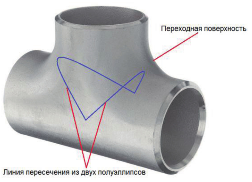 Линия пересечения представляет собой две пересекающиеся плоские кривые (эллипсы a и b). Другое решение (слева), выполненное при тех же исходных данных стандартным функционалом КОМПАС-3D, является ошибочным: имеются две пространственные кривые (c и d). Очевидно, технологическое формообразование детали по линии пересечения должно выполняться по варианту справа. В этом случае соединение составных поверхностей детали на основе сварного шва будет производиться электродом сварочного аппарата по двум плоским траекториям за одну установку в отличие от варианта слева с двумя разомкнутыми пространственными траекториями.