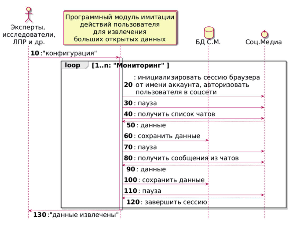 При проектировании программного модуля эмуляции действий пользователя для сбора данных социальных сетей выделены следующие этапы (рисунок 3):
