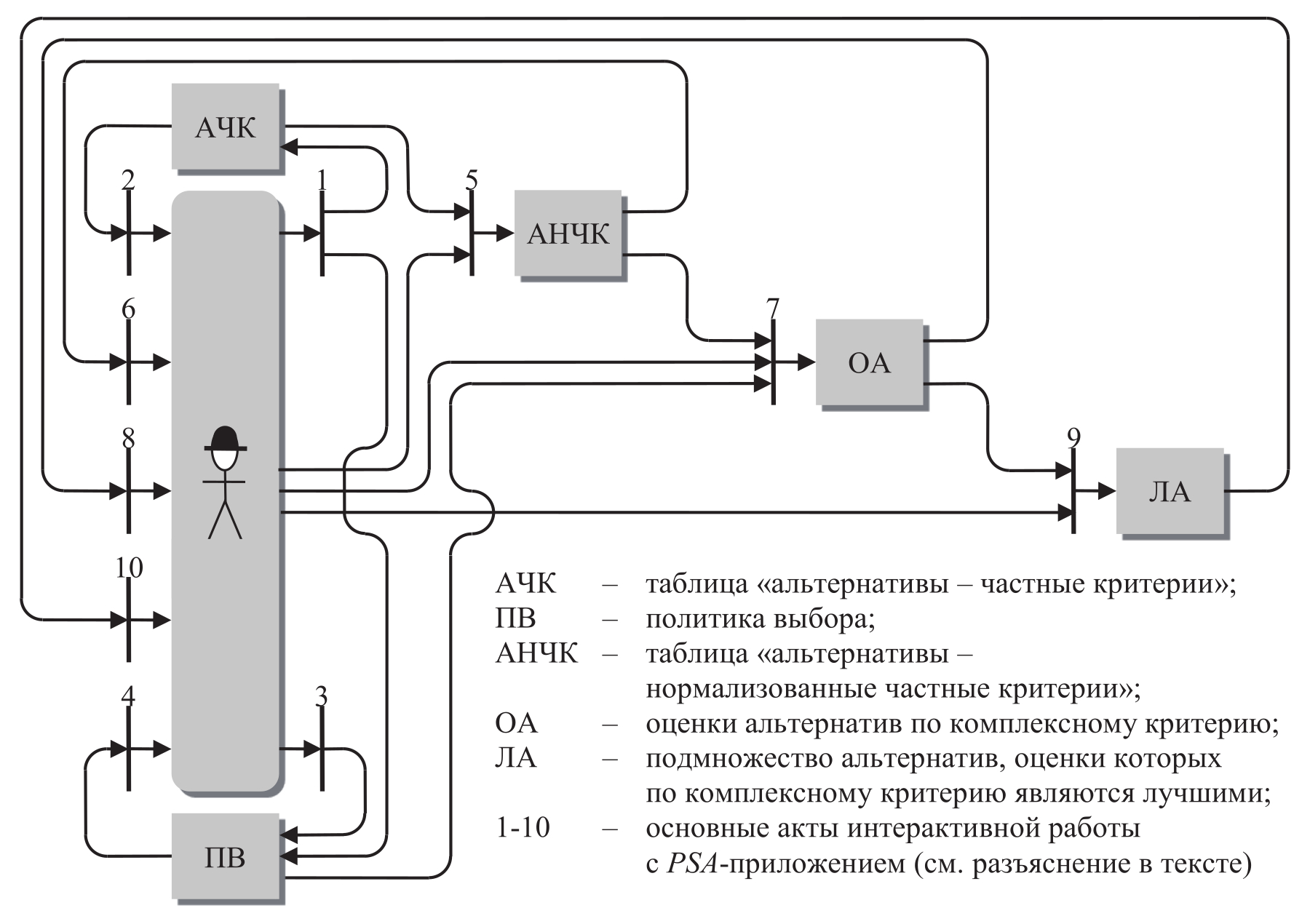 - 1 – формирование и редактирование соответствия «альтернативы – частные критерии» (АЧК), которое представляет собой основу многозначного контекста PSA‑задачи