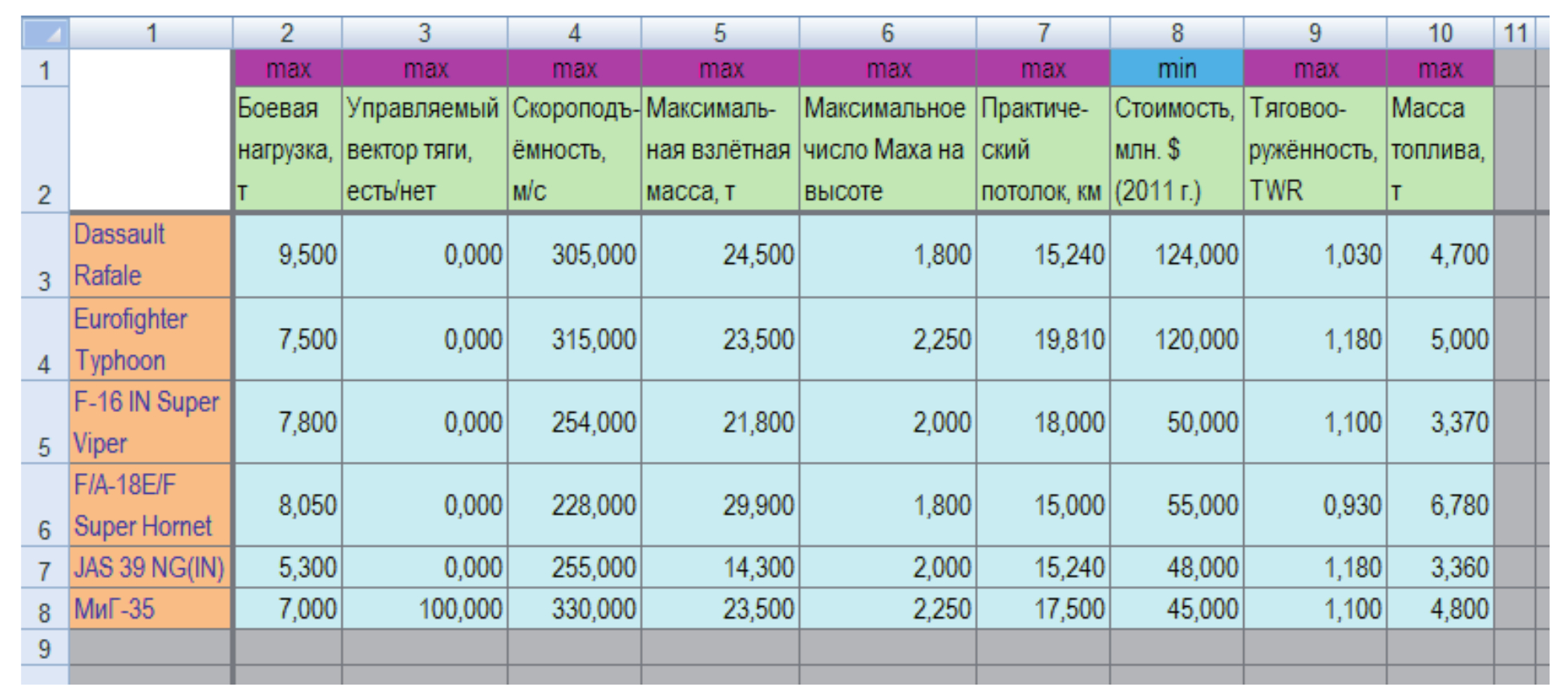 В [16] рассматривается задача сравнения по тактико-техническим характеристикам (ТТХ) боевых самолётов, принимавших участие в индийском тендере MMRCA (2011 г.). На рисунке 5 приведён фрагмент скриншота листа «Альтернативы» PSA-книги, где отражён многозначный контекст этой многокритериальной задачи в формате (1).