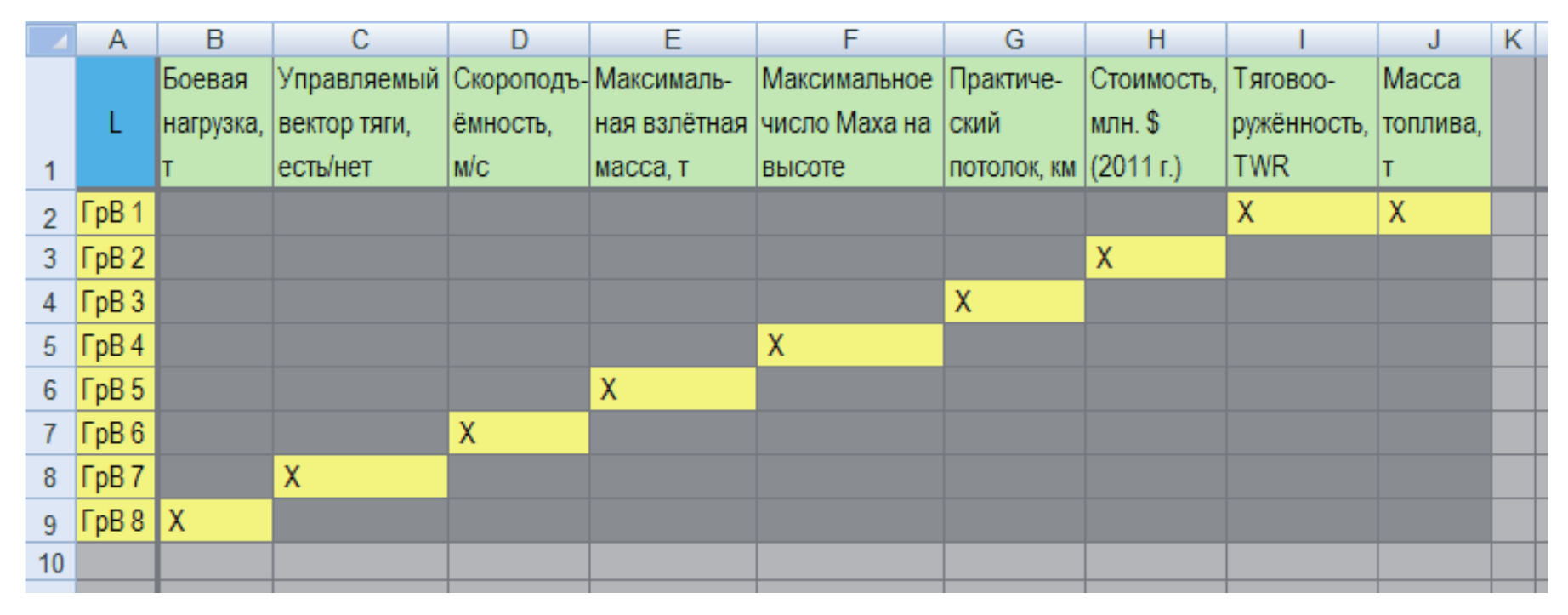 На рисунке 6 дан фрагмент скриншота листа «Политика выбора», где интерпретирована и зафиксирована согласно (2) описанная в [16] точка зрения на отношение «предпочтительности» на множестве частных критериев – показателей ТТХ самолётов, – а также вид комплексного критерия альтернатив – «обобщённой эффективности» самолётов как средневзвешенной свёртки ТТХ.