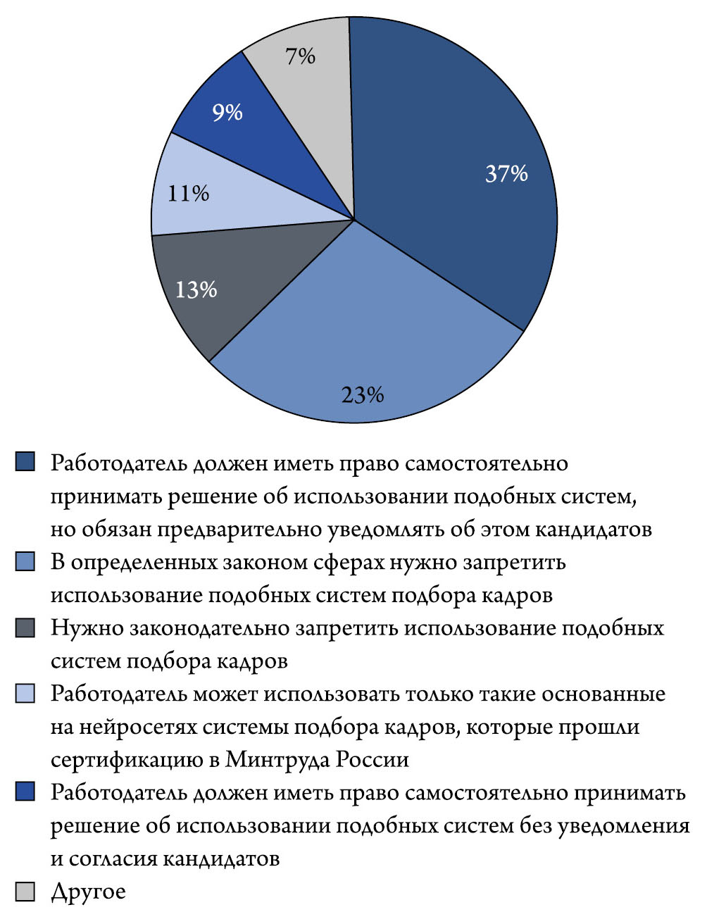 Понимая опасность таких последствий, авторы настоящего исследования поставили перед респондентами следующий вопрос: «Нужно ли законодательно закрепить отдельное право кандидата требовать, чтобы его кандидатура рассматривалась сотрудником кадровой службы, а не автоматизированной HR-системой?». При этом мы учитывали, что ст. 16 Федерального закона от 27 июля 2006 г. № 152-ФЗ «О персональных данных» (ред. от 06.02.2023) запрещает принятие юридически значимых решений в отношении субъекта персональных данных на основании исключительно автоматизированной обработки его персональных данных, поскольку такие решения порождают юридические последствия или иным образом затрагивают права и законные интересы субъекта персональных данных. Исключения предусмотрены только для тех случаев, когда имеется письменное согласие субъекта персональных данных «или в случаях, предусмотренных федеральными законами, устанавливающими также меры по обеспечению соблюдения прав и законных интересов субъекта персональных данных» (п. 2 ст. 16).