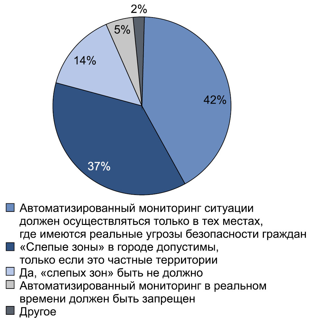 Немного меньше опрошенных (37%) предпочли опереться на противопоставление частных и публичных пространств и посчитали, что «слепые зоны» в городе допустимы, только если это частные территории. При этом 14% респондентов решили, что «слепых зон» в принципе быть не должно, а 5%, наоборот, высказали мнение, что автоматизированный мониторинг в реальном времени должен быть запрещен.
