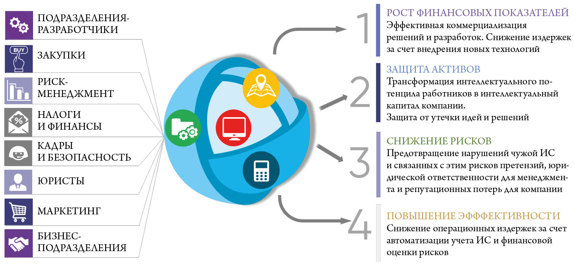 Как только от юридических и иных знаний осуществляется переход к экономическим категориям, сфера управления ИС становится понятной собственникам и руководителям компаний и предприятий и органично «вписывается» в современную систему проблем и задач, стоящих перед ними — от упомянутой цифровой трансформации и извлечения прибыли до противодействия санкционному давлению.