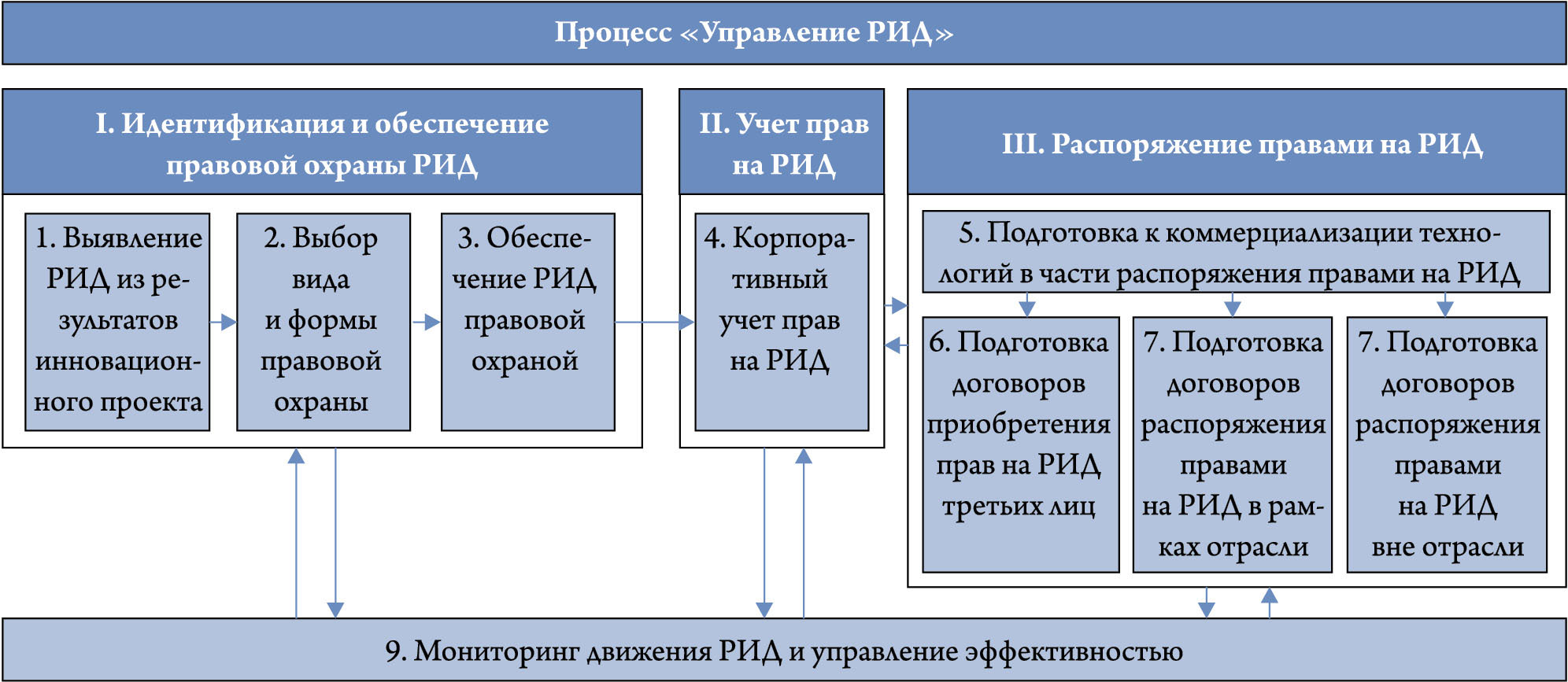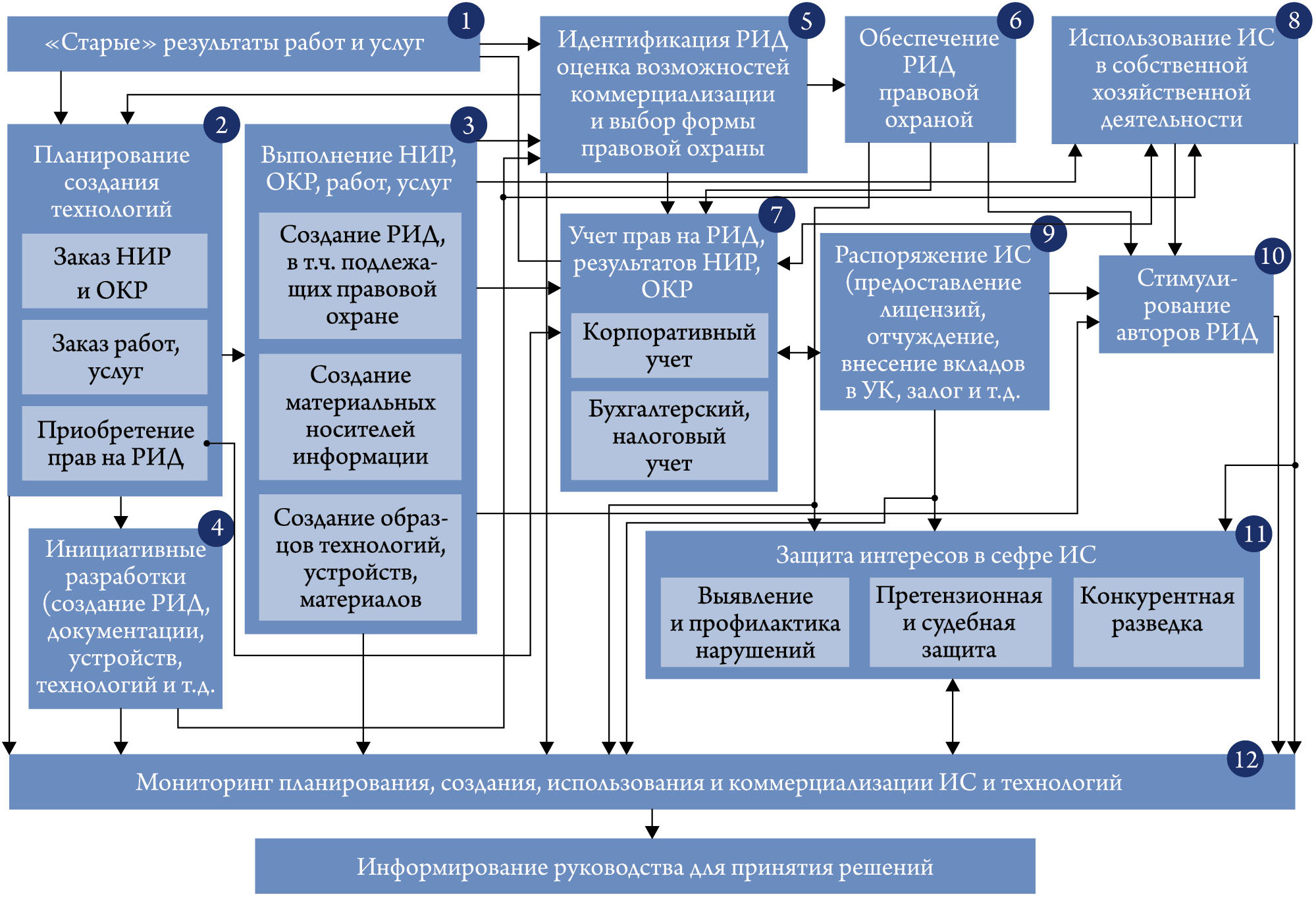 Ключевые стадии процессов принятия решений и предметных действий в рассматриваемой сфере, возникающие с момента планирования создания объекта ИС и длящиеся до момента решения задач бизнеса, представлены стадиями учета объектов, их юридической защиты, оценки для бизнеса и распоряжения. Параллельно или дополнительно к ним могут реализовываться те или иные актуальные для бизнеса задачи как стратегического, так и тактического свойства (построение патентных ландшафтов, конкурентная разведка, мониторинг правонарушений и т.п.).