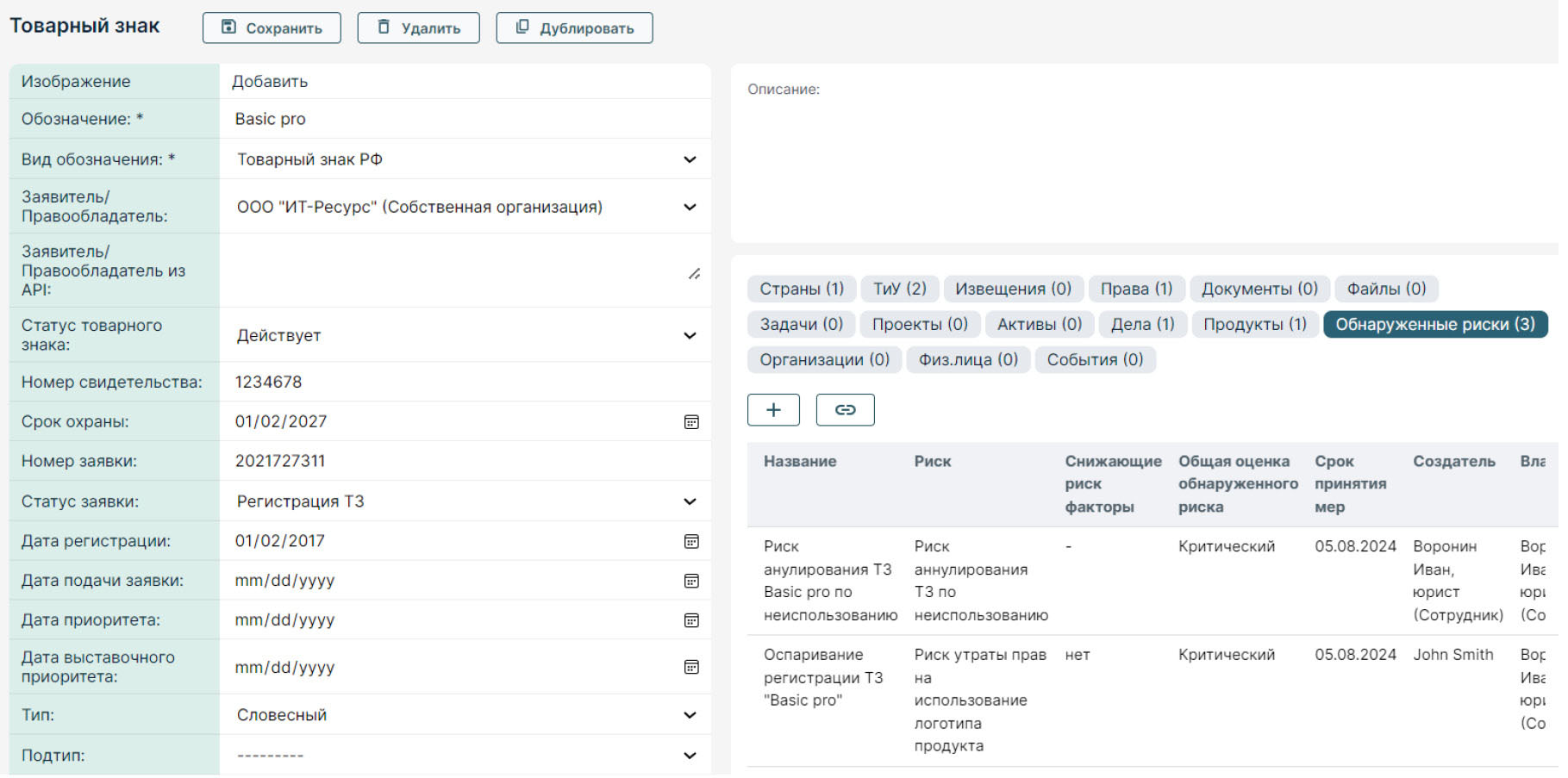 Система позволяет вести учет типовых рисков, связанных с интеллектуальной собственностью и отраслевой спецификой, а также проводить учет обнаруженных рисков применительно к конкретным объектам интеллектуальной собственности и принятым мерам. Посредством различных рабочих экранов организуется подготовка информации как для принятия управленческих решений, так и для управления решением в юридической функции (см. рис. 8, 9).