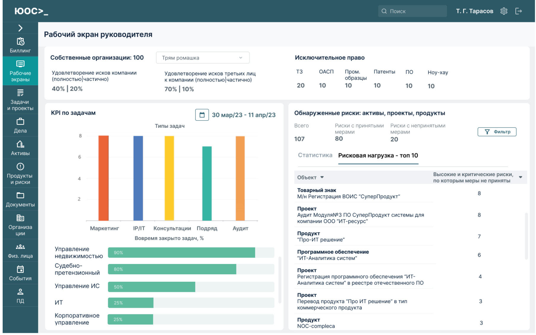 Рисунок 8. Рабочий экран руководителя с аналитикой по делам, ИС, рискам и KPI
