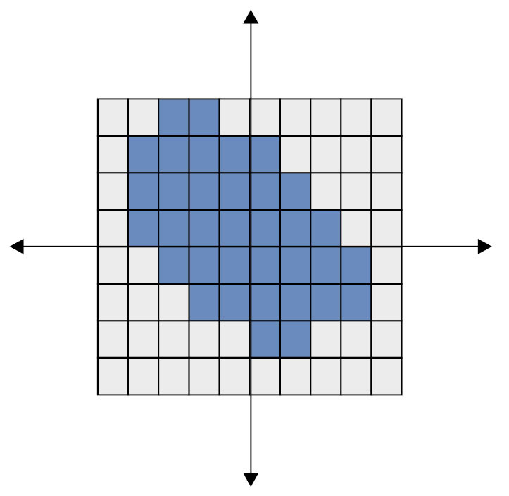 Рассмотрим модель произвольного творческого произведения на основе декартовой системы координат (рис. 1), где закрашенные клетки-ячейки представляют собой содержание того или иного фрагмента «интеллектуальной» деятельности. Смысловые связи между предложенными результатами неясны, это лишь отдельные, отстраненные друг от друга координатные ячейки. ИИ может обучаться на множестве стихов, произведений искусства. Он, возможно, даже обнаруживает связи между ними, чтобы правдоподобно соединить фрагменты, но не устанавливает их смысл, что мы и видели на примере с таблицей Менделеева.