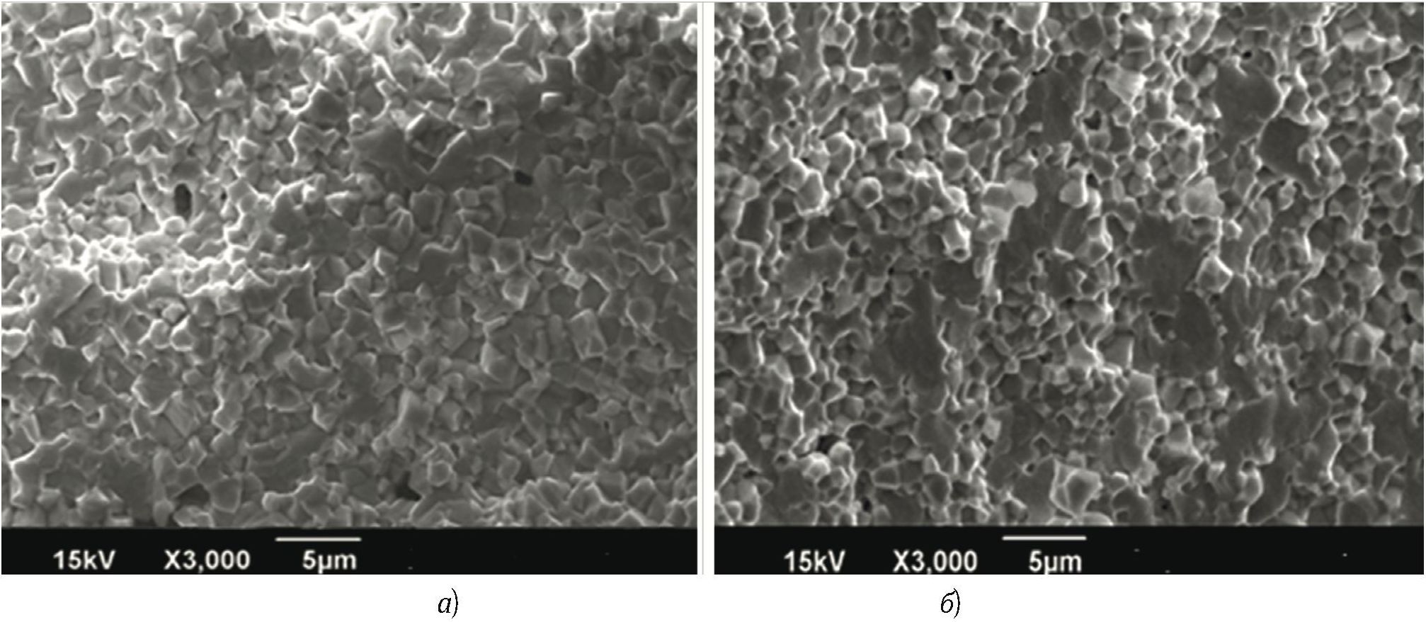 Рис. 3. Микроструктура ПКМ на основе фазы Bi0.67Ba0.33Fe0.73Ti0.27O2.94F0.06: а) до поляризации; б) после поляризации.