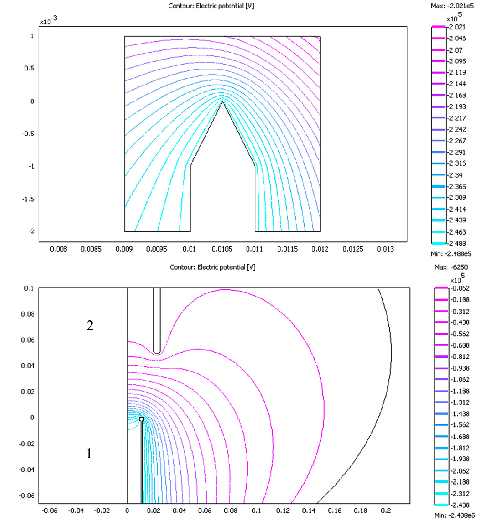 Рис. 4. Геометрия расположения катода и анода и линии уровня: а) вблизи острийного катода; б) вблизи лезвийного катода 1 и анода 2.