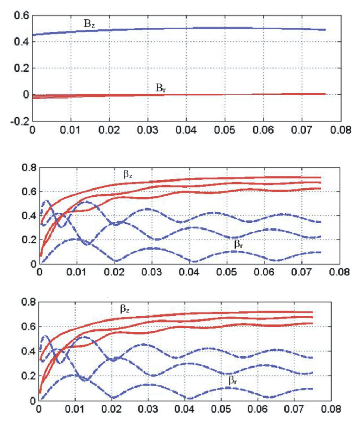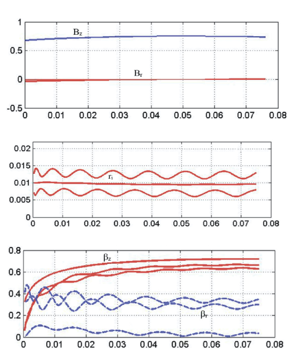 Сравнение характеристик на рис. 7 и 8 указывает на то, что наличие подъема магнитного поля приводит, с одной стороны, к «поджатию» пучка, с другой — к увеличению поперечной составляющей скорости электронов, что крайне нежелательно. Величина и период колебаний электронных траекторий определяются ларморовским радиусом и зависят от величины магнитного поля.