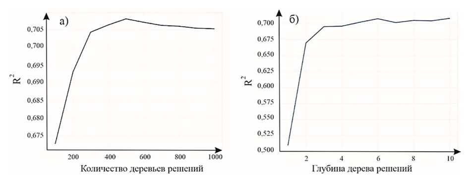 Рис. 3. Распределение значений R2 по параметрам модели «дерево решений»: а) n_estimators; б) max_depth