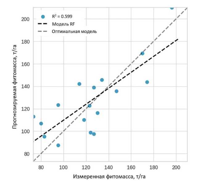 Интеграция оптимальных значений параметров в модель «Случайного леса» с использованием наборов данных ТУ для обучения и тестирования позволила получить следующие статистики: R2=0,60, MAE=17,6 т/га, RMSE=20,9 т/га, что достаточно для формирования модели расчёта фитомассы на территории исследования. На рис. 4 показано распределение данных фитомассы, сгенерированных по алгоритму «Случайный лес» и по тестовым участкам, на территории заказника «Сосновоборский». Отдельные прогнозные значения фитомассы (в виде точек) располагаются близко к оптимальной модели (сплошная линия). В целом, на рис. 4 наблюдается низкий уровень дисперсии в модели «Случайный лес» в сравнении с оптимальной линией, в которой распределение точно соответствует модели, что свидетельствует о приемлемом качестве принятой модели для оценки фитомассы.