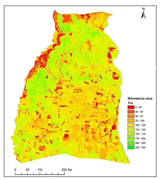 Рис. 7. Распределение фитомассы на исследуемой территории, полученной с использованием модели «Случайный лес»