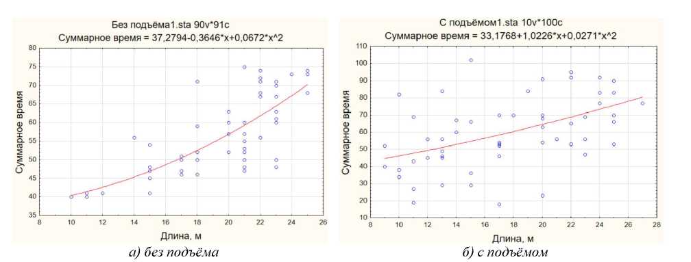 Обработка экспериментальных данных выполнялась с использованием программы Statistica-12. Рассеяние значений средней продолжительности технологических элементов обработки одного дерева в зависимости от длины ствола без подъёма и с подъёмом комлевой части при падении представлены на рис. 3. Такое рассеяние значений средней продолжительности элементов обработки одного дерева обусловлено как ситуационной обстановкой и расположением деревьев на лесосеке, так и введением нового элемента в технологический процесс. Представленные на рис. 3 регрессионные зависимости носят ориентировочный характер, но позволяют сравнить два варианта исполнения технологического элемента.
